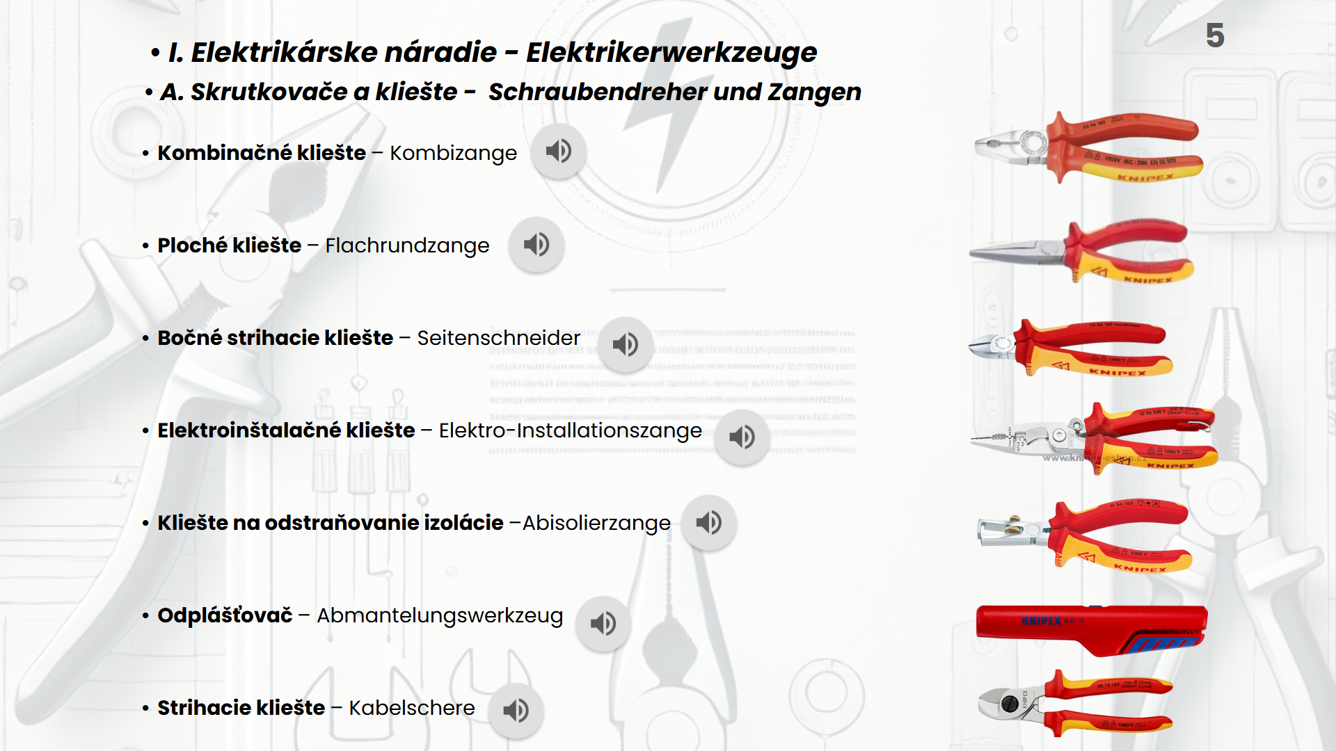 najčastejšie používané pokyny od majstra (napr. prines kábel, skontroluj vypínač, zapoj rozvádzač…)